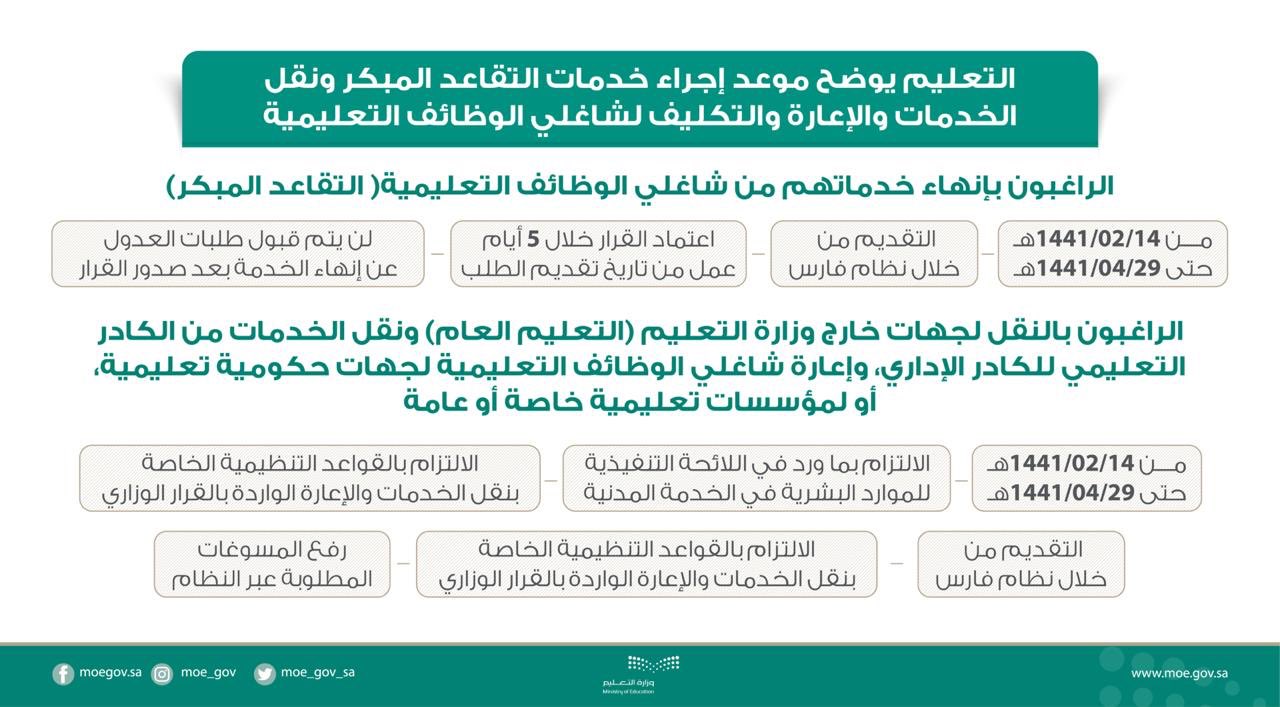وزارة التعليم عام On Twitter وزارة التعليم توضح موعد إجراء خدمات التقاعد المبكر ونقل الخدمات والإعارة والتكليف لشاغلي الوظائف التعليمية Https T Co Usq7hdijrj Https T Co Qh8pevthbw
