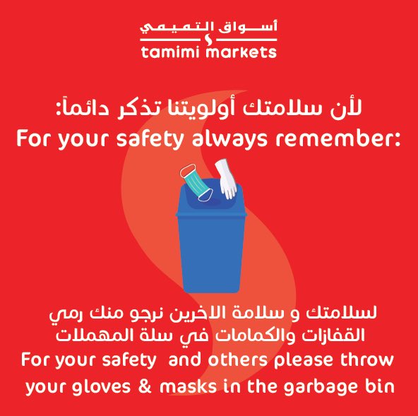 أسواق التميمي On Twitter لما تنتهي من رحلة التسوق لا تنسى ترمي القفازات و الكمامات في سلة المهملات و ذلك لحمايتك و حماية غيرك من انتشار اي عدوى كلنا مسؤول Https T Co C2gaex0pp9